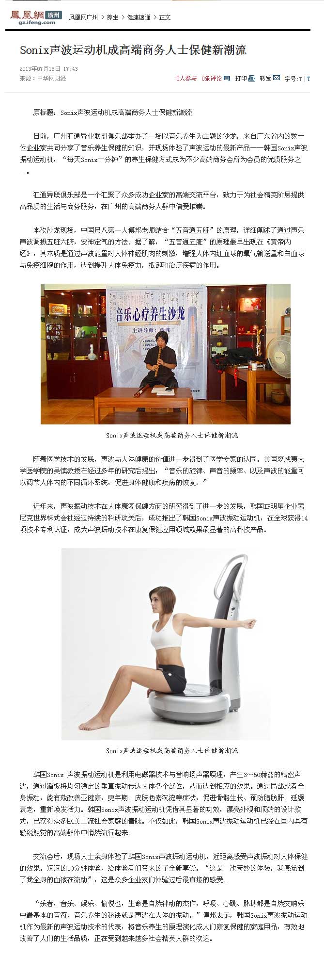今天网易、凤凰、人民、新华、新浪等二十几家中国新闻网站报道“Sonix声波振动运动机成高端商务人士保健新潮流”。