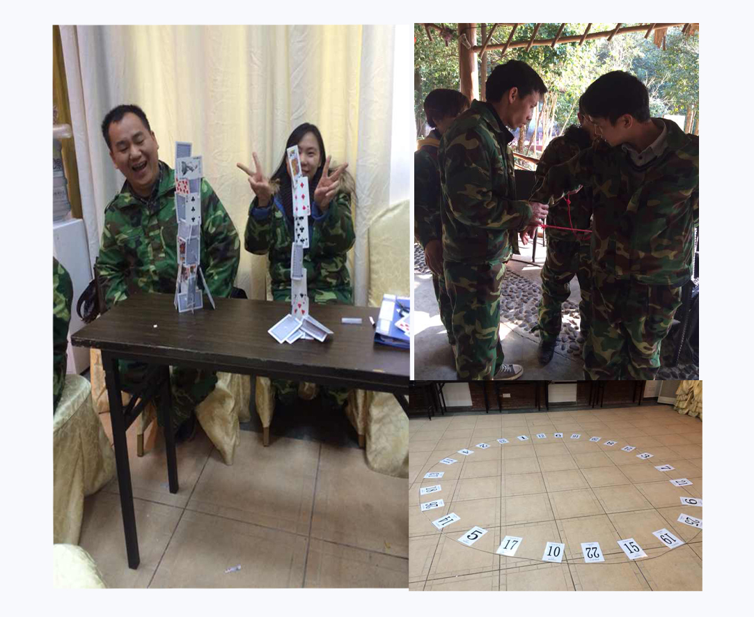 (左图:用扑克牌建大厦,右上:解红绳,右下:按顺序拍数)