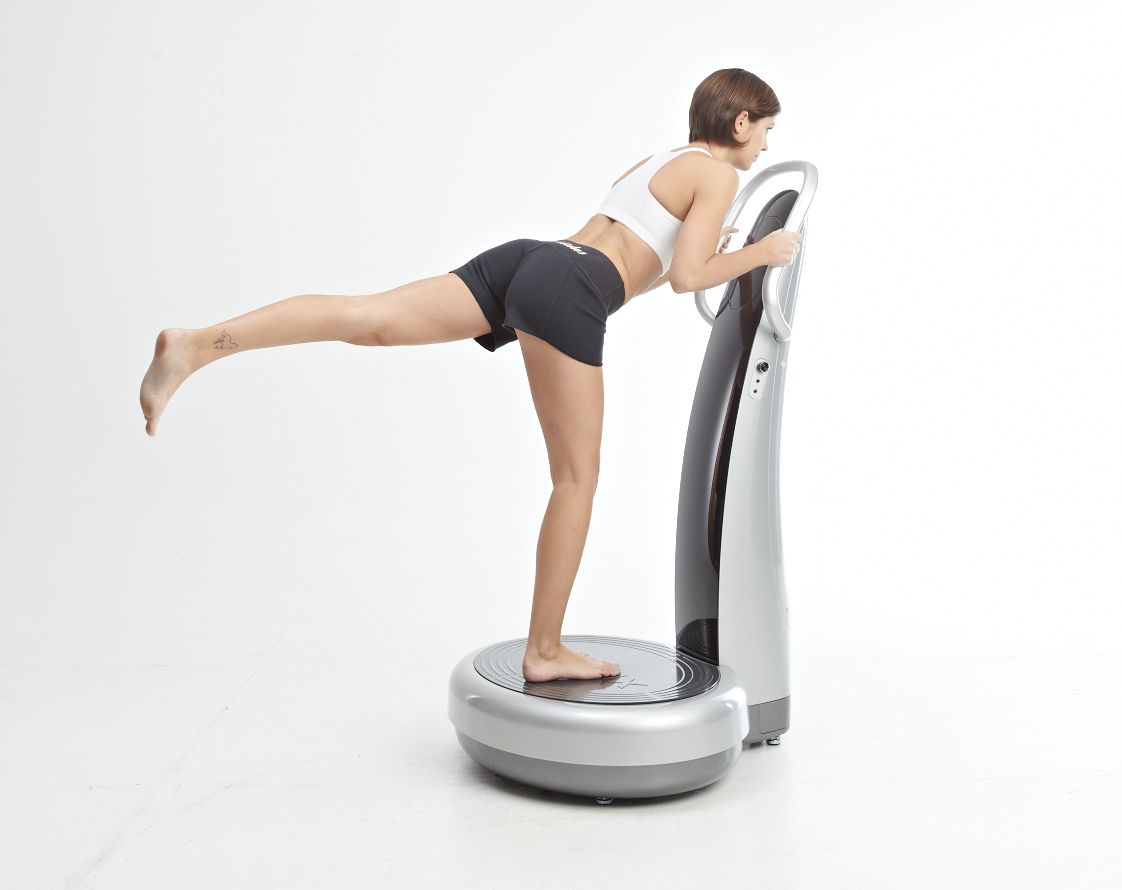 站立于机板中间,双腿分开与肩同宽,双臂弯曲90度,与地板成水平,抬起至与肩同高,以骨盆为中心,保持水平左右旋转上身,不得转动膝盖或上身倾斜,保持正确姿势站立。以18HZ-22HZ频率振动,这个姿势可以舒缓腰部。