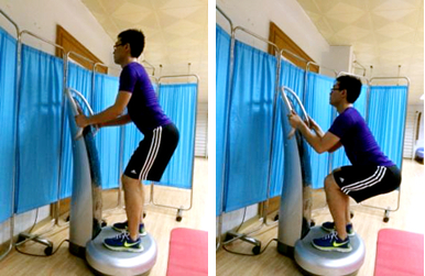 当然,你也可以通过运动机器来完成这个动作。站于运动机上,腰部挺直,臀部下蹲,做重复动作。注意:下蹲时从侧位看膝盖不可超过脚趾。