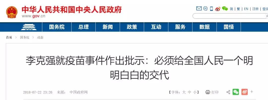 中国政府网于(7月22日)23:26发布了总理对疫苗事件的批示。