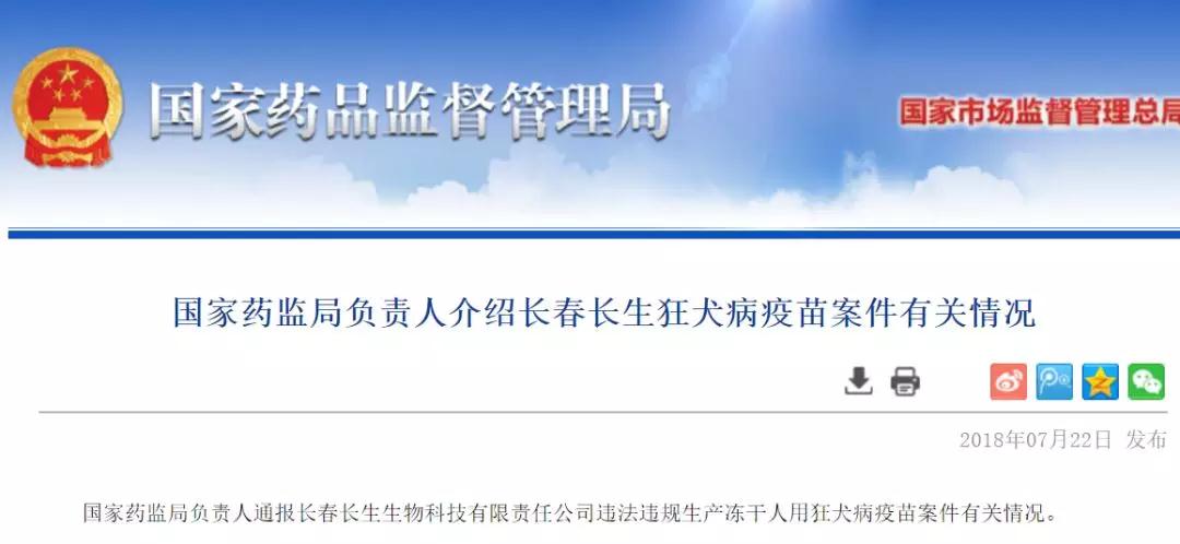 7月22日,国家药监局再次通报长春长生生物违法违规生产冻干人用狂犬病疫苗案件有关情况。
